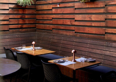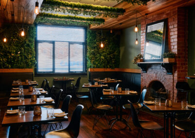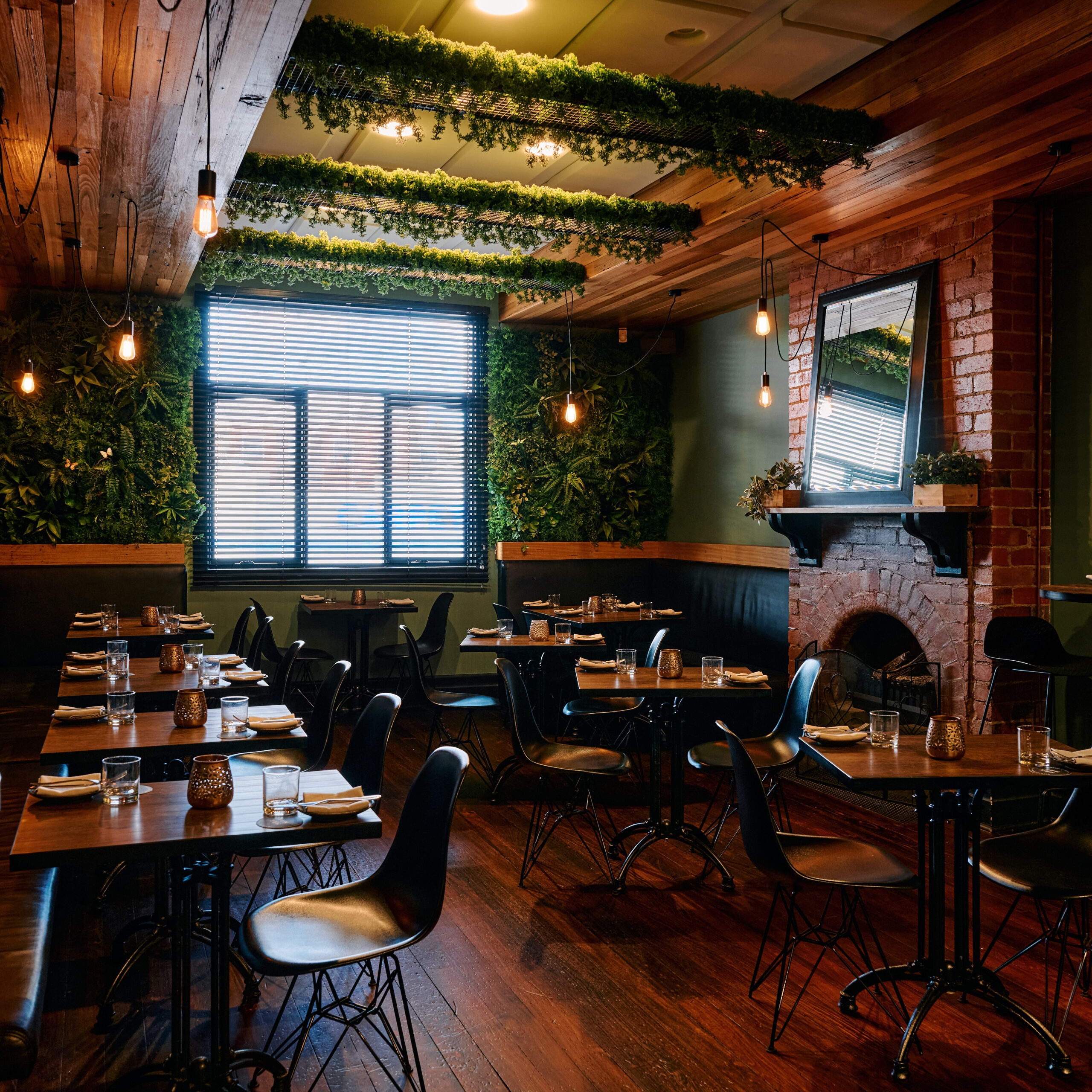 The upstairs dining space is decorated with beautiful green foliage and has sultry mood lighting in the evenings.
